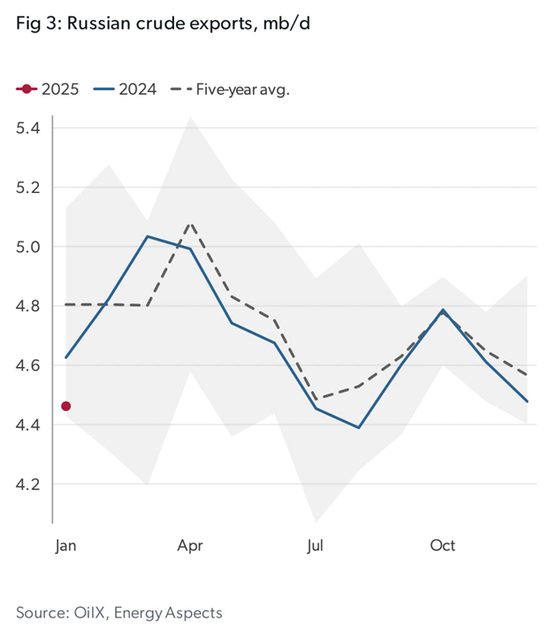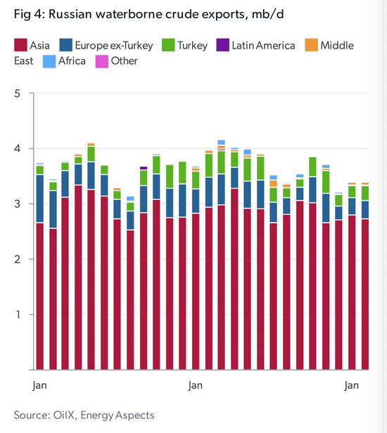 国际能源咨询公司EnergyAspects发布的报告称,2024年至少有464艘油轮运输了俄罗斯原油;其中108艘被列入美国最新制裁名单,约占俄罗斯海运原油出口总额的45%。中国进口俄罗斯海运原油的70%由此次美国制裁的油轮交付,即约4000万吨。